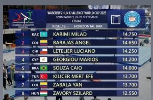 Luego de conquistar la medalla de plata en París, el colombiano volvió a subir al podio, esta vez en la Copa del Mundo de Szombathely, donde se destacó con una brillante actuación en la barra fija.